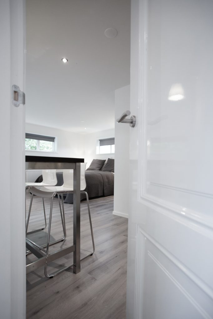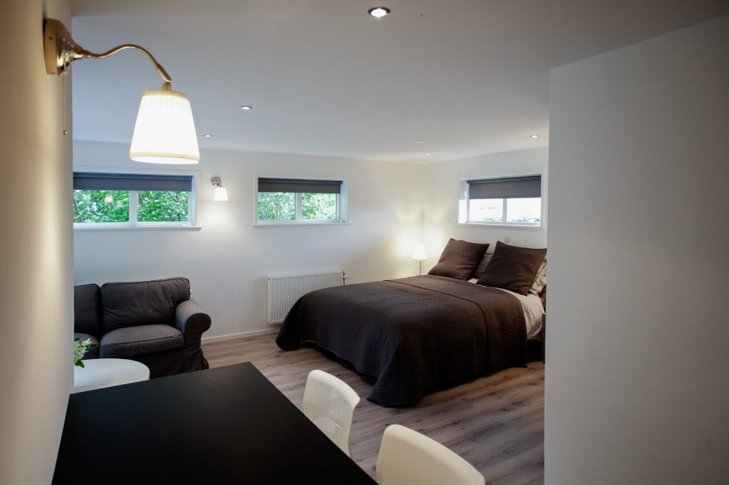 Dit luxe studio-appartement is gevestigd op de begane grond van het twee onder één dak complex. De studio met 2-persoonsbed, zithoek, eethoek, koelkast en TV heeft een eigen entree en privé-badkamer met douche en toilet.